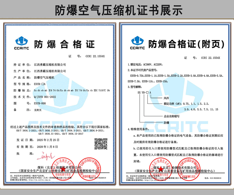 勇霸防爆空气压缩机具有整机防爆合格证证号:CCRI 22 .1554X
